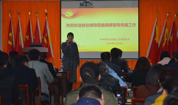 2017 年11 月29 日上午,實(shí)驗(yàn)區(qū)黨工委組織部組織區(qū)機(jī)關(guān)黨工委、各辦事處(IT 社區(qū))黨工委、興港公司黨委和港區(qū)7家非公企業(yè)黨建負(fù)責(zé)同志62 人蒞臨萬達(dá)重工黨支部觀摩指導(dǎo)黨建工作。萬達(dá)重工黨支部副書記于江山、紀(jì)律委員薛如勛、宣傳委員張夢(mèng)珠等人隨行陪同并講解企業(yè)運(yùn)營、企業(yè)文化及黨建工作情況。