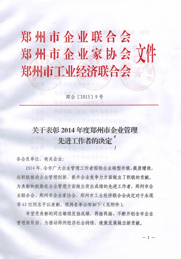 熱烈祝賀我公司白楊同志獲得鄭州市企業(yè)管理先進(jìn)工作者稱號