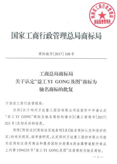 熱烈祝賀鄭州萬達(dá)重工股份有限公司“益工”商標(biāo)被認(rèn)定為中國馳名商標(biāo)