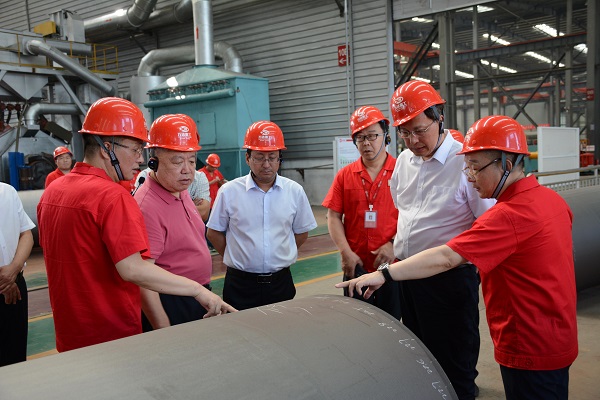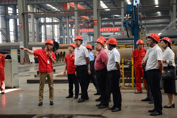 張會長一行先后深入堆焊智能制造車間、彎制車間、機加工、物流倉儲等生產(chǎn)車間進行了參觀,實地查看了公司先進的生產(chǎn)設(shè)備、繁忙而有序的生產(chǎn)環(huán)境,股份公司總經(jīng)理張付峰分別就公司生產(chǎn)設(shè)備、技術(shù)及生產(chǎn)能力情況向調(diào)研組一行進行了詳細講解,調(diào)研組一行對萬達重工現(xiàn)代化的管理理念,一流的生產(chǎn)能力表示贊賞。