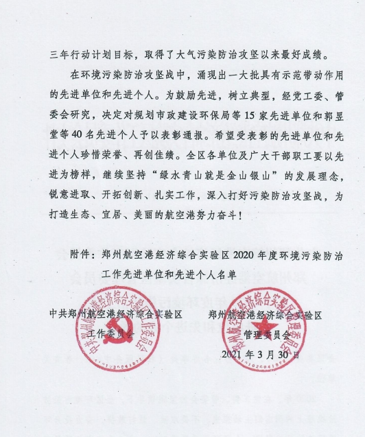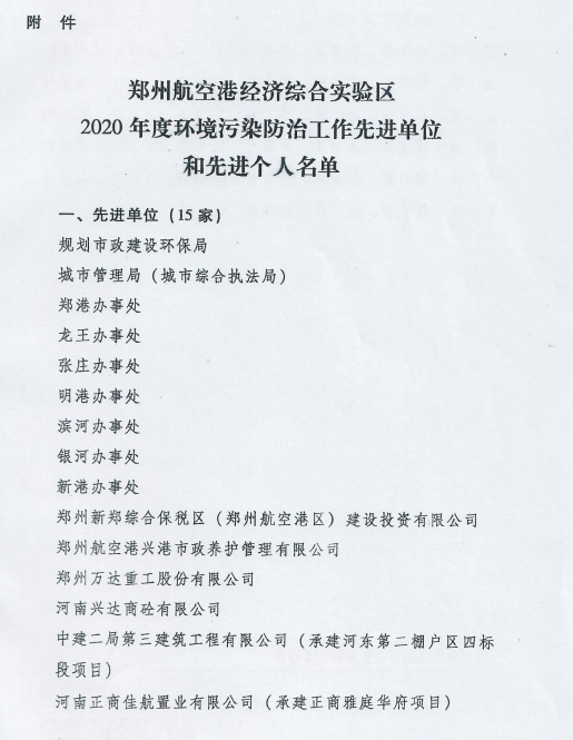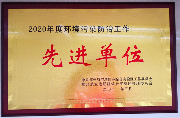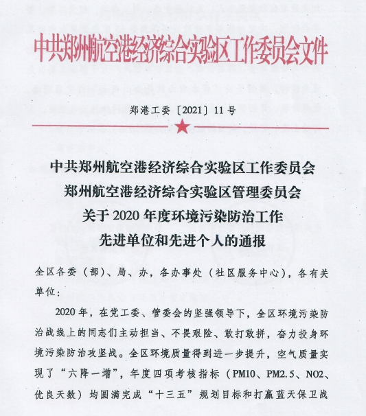 鄭州萬(wàn)達(dá)重工股份有限公司榮獲鄭州航空港經(jīng)濟(jì)綜合實(shí)驗(yàn)區(qū)2020年度環(huán)境污染防治工作先進(jìn)單位
