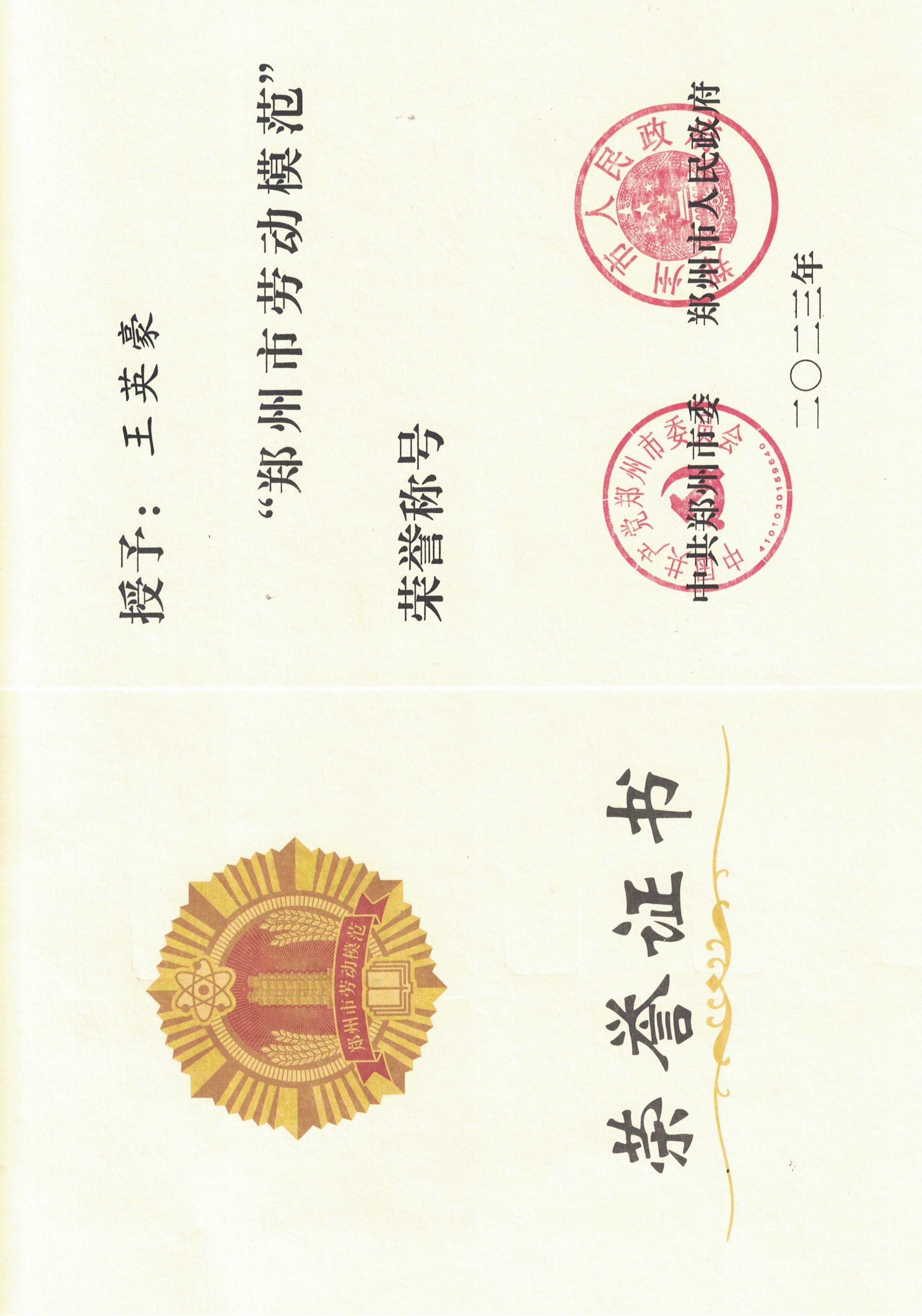 熱烈祝賀公司首席質(zhì)量官王英豪榮獲“鄭州市勞動(dòng)模范”榮譽(yù)稱號(hào)及獎(jiǎng)?wù)?