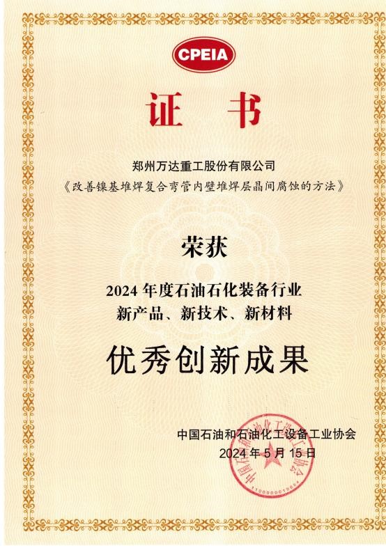 為進(jìn)一步推廣和宣傳公司技術(shù)創(chuàng)新成果,更好的為開(kāi)拓市場(chǎng)助力,持續(xù)提升企業(yè)核心競(jìng)爭(zhēng)力,根據(jù)中國(guó)石油和石油化工設(shè)備工業(yè)協(xié)會(huì)發(fā)布的《關(guān)于征集石油石化裝備行業(yè)“2024年度新產(chǎn)品、新技術(shù)、新材料”科技創(chuàng)新成果的通知》要求,經(jīng)過(guò)企業(yè)自愿申報(bào)、行業(yè)專家審查初選、終選與展示等環(huán)節(jié),萬(wàn)達(dá)重工自主研發(fā)的 “改善鎳基堆焊復(fù)合彎管內(nèi)壁堆焊層晶間腐蝕的方法”技術(shù)成果被評(píng)選為2024年度中國(guó)石油石化行業(yè)“優(yōu)秀創(chuàng)新成果”,與中石油、中石化、中海油、寶雞石油、南陽(yáng)二機(jī)、西安陜鼓等多家行業(yè)優(yōu)秀企業(yè)的創(chuàng)新產(chǎn)品和技術(shù)成果共同在“2024年第三屆石油石化裝備產(chǎn)業(yè)科技大會(huì)暨科技創(chuàng)新成果展覽會(huì)”上進(jìn)行發(fā)布和推廣,公司品牌總監(jiān)白楊參加會(huì)議并領(lǐng)取成果榮譽(yù)證書。