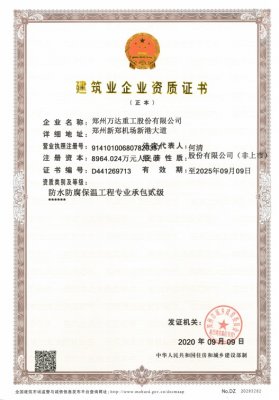 熱烈祝賀鄭州萬達重工股份有限公司獲得《防水防腐保溫工程專業(yè)承包貳級資質(zhì)》